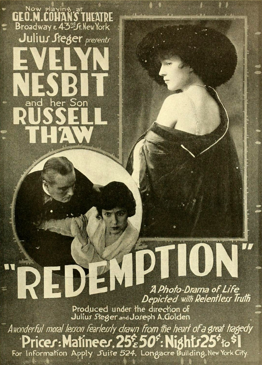 Pero, ¿qué tiene que ver el cine con todo esto? En primer lugar, obviamente el suceso provocó el surgimiento de numerosas películas basadas en él, además de convertir a Evelyn en una artista de vodevil muy cotizada. Pero lo más curioso llegó en 1914, cuando toda la historia ya había quedado atrás y Nesbit decidió probar suerte en el cine actuando en una película titulada The Threads of Destiny junto a su hijo. A ésta le siguió Redemption (1917), con ecos de su historia real, como un turbio pasado relacionado con un arquitecto de renombre y The Man Who Gave (1918). Por supuesto los films fueron grandes éxitos de taquilla por el morbo que suponía verla a ella en un papel similar a su vida real.