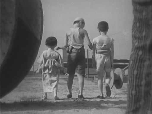 Por otro lado, qué gran director era Ozu a la hora de plasmar la infancia. Pocos cineastas pueden conseguir como él mostrar de forma tan auténtica a los dos niños protagonistas, tanto su faceta más irresponsable e irreflexiva como la más tierna, la que demuestra que saben lo desesperado de su situación (“¿Qué preferís? ¿Comer y luego dormir fuera, o no comer y luego dormir en un albergue?” “Comer y luego dormir en un albergue”). Servidor no es muy amigo de las actuaciones infantiles, pero en películas como ésta el director consigue que parezcan tan reales que uno no puede evitar hacer una excepción. Y si quieren una prueba, ahí tienen la sencilla y preciosa escena en que el padre y el hijo mayor se imaginan estar comiendo arroz para engañar el hambre, donde la complicidad entre ambos queda más que puesta de manifiesto.