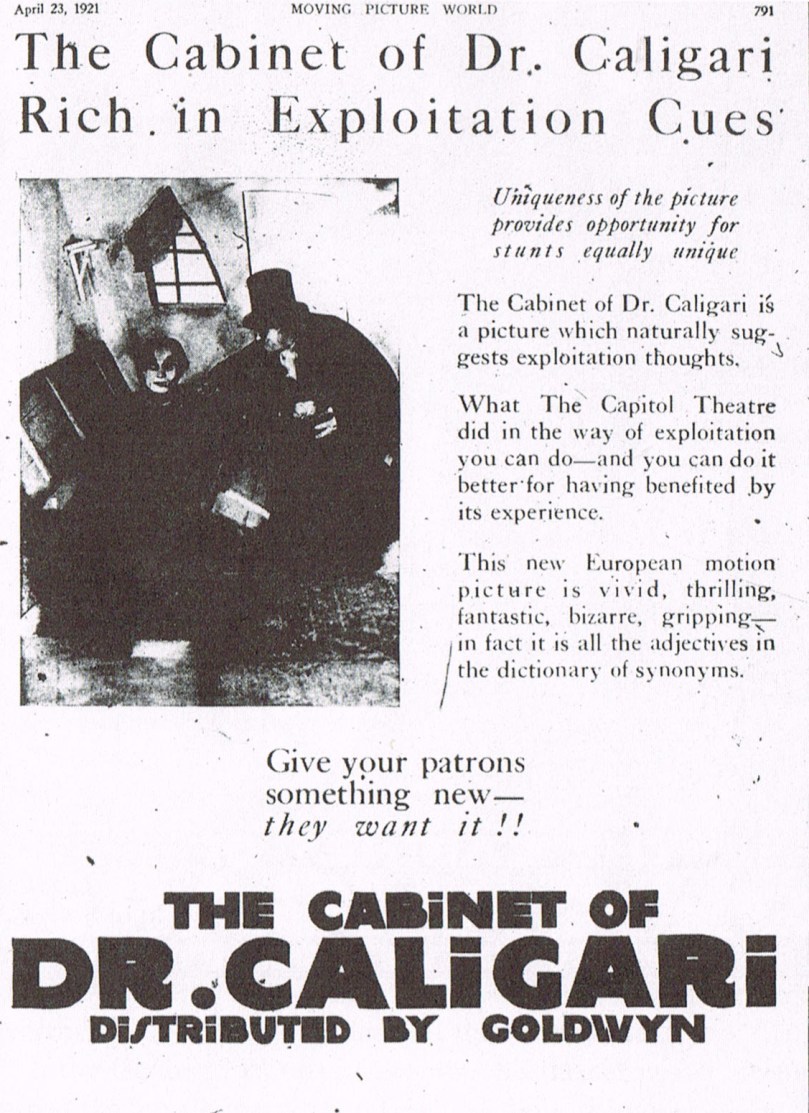 Cuando la película estuvo lista para el estreno tuvo lugar una campaña de publicidad muy audaz y fuera de lo común. Por todo Berlín empezaron a aparecer unos pósters de apariencia muy inquietante que simplemente decían «Du musst Caligari werden» («Debes convertirte en Caligari«), que como hoy día sabemos, es la frase que se le mete en la cabeza al personaje de Werner Krauss cuando se vuelve loco. Este tipo de estratagemas ya se habían usado antes (recuerden si no el caso de Les Vampires (1915) de Louis Feuillade) pero los productores consiguieron su propósito: atraer la atención del público, que no sabían a qué hacían referencia los carteles ni quién era el tal Caligari. Recordemos que además eran años muy convulsos a nivel político y social, de modo que un cartel de dichas características podía referirse literalmente a cualquier cosa.