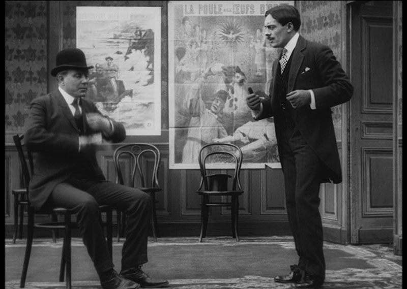 Primer detalle a destacar del film: el utilizar a nombres destacados de Pathé interpretándose a sí mismos, incluyendo al gran hombre, Charles Pathé (el señor con bigote que al inicio del film está tan ocupado al teléfono) y uno de los directores más destacados del estudio, Lucien Longuet, que encarna aquí al realizador que dirige a Max. El siguiente aspecto que tanto me gusta es que la película da esa visión del mundo del cine como de un oficio de locos donde para seleccionar a un candidato se le obliga a tirarse por el suelo y soportar unas bofetadas, que me recuerda a los relatos de gente como Mack Sennett y Buster Keaton en sus autobiografías, cuando narraban los casos de aspirantes a actores que acudían a estudios de slapstick dispuestos a cualquier cosa por un buen papel.
