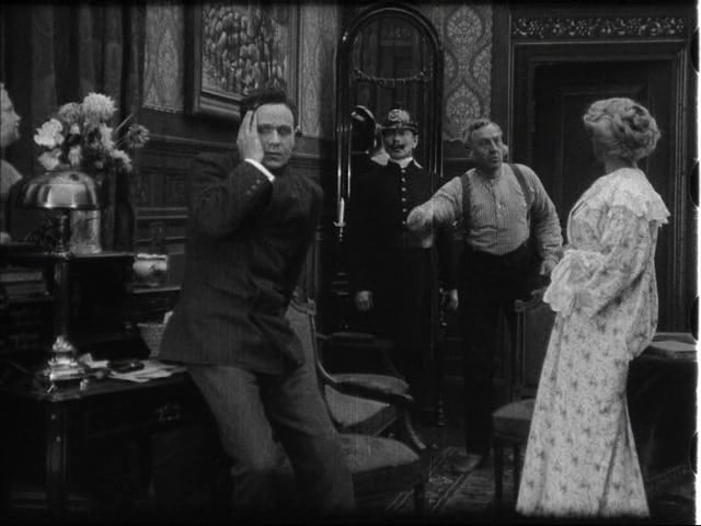 Cuando este Doctor comentó The Candle and the Moth (1915) del mismo Blom, ya destacó el uso que se hacía de los espejos en algunas escenas como alternativa al plano y contraplano, ya que por entonces no se había consolidado aún el montaje tal y como conocemos hoy día y se optaba por incluir en el mismo plano su correspondiente contraplano a través del espejo. En esta película cuatro años anterior ya vemos un ejemplo de ello. El hombre de gafas va a visitar a la madre de la protagonista para cobrarse las deudas de juego y curiosea entre el mobiliario de la casa mientras le hacen esperar. En cierto momento aparece el mayordomo y, disimuladamente, deja el candelabro que estaba manoseando. La forma de indicarnos que ha oído la llegada del criado es, obviamente, el espejo situado a su lado.