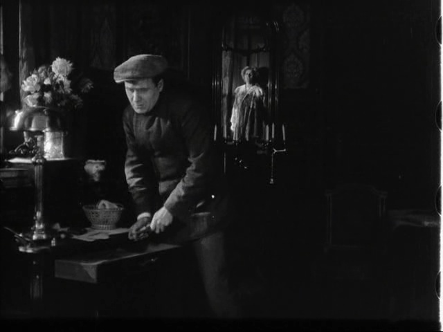 Por último otro ejemplo de uso de espejos, con motivos mucho más dramáticos, pero también de la composición de la luz. Es un plano bellísimo, casi fotográfico, en que se deja toda la habitación en penumbra salvo el foco de luz que es además el lugar al que se dirige el protagonista para cometer el robo. En el cine mudo se establecería como convención que para indicar que un plano sucede en un sitio a oscuras se tintara toda la escena de azul oscuro, y para indicar que hay luz pasaría a tintarse de un color más claro, normalmente amarillento. En este plano se nos muestra cómo en realidad un cuidado uso de la iluminación puede conseguir el mismo efecto de mejor manera sin recurrir al tintado: el momento en que se encienden las luces en contraste con la oscuridad anterior es magnífico, y el cruce de miradas entre los cuatro actores situados en tres sitios distintos, cada uno de ellos con intencionalidades diferentes, demuestra la complejidad de la puesta en escena de Blom. Este hombre definitivamente sabía lo que se traía entre manos.