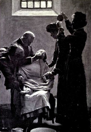 Fotografía de una sufragista obligada a ingerir alimentos