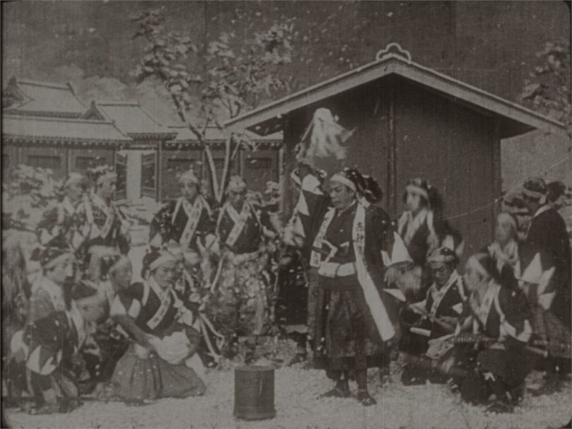 Muchos de estos filmes los protagonizó a las órdenes de Shozo, a quien conocía de sus tiempos en el kabuki por ser el propietario de uno de los teatros donde más a menudo trabajaba. Juntos habían filmado ya varias versiones del célebre relato de los 47 ronin, seguramente la historia de samurais más célebre en Japón: sólo entre 1907 y 1925 se contabilizan unas 60 versiones de la misma, y después vendrían muchas otras – siendo quizá la más recordada a día de hoy la que realizó Kenji Mizoguchi en 1941. Para complicar aún más el trabajo a los historiadores actuales, era frecuente que estas nuevas versiones reaprovecharan planos o escenas completas de otras precedentes, de forma que las pocas que han llegado a nuestros días se hacen un tanto difíciles de situar en una fecha concreta. La que yo vi en Pordenone y que comento aquí se basa en fragmentos de la versión de 1910 y de 1917, si bien la que predomina claramente es la de 1910, es decir, la anterior a ese cambio que hizo Shozo de cara a dar un enfoque más renovador a su cine y por tanto una muestra bastante clara de lo que era el cine primitivo japonés.