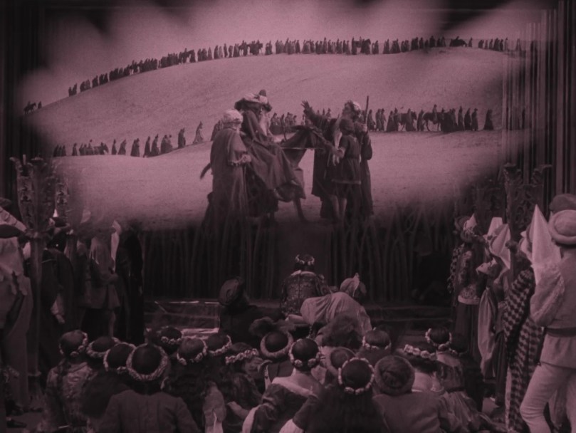 Mi escena favorita corresponde al otro gran momento fantástico del filme cuando el rabino acude con el golem a la corte del emperador y evoca en imágenes el pasado del pueblo judío. Cuando los miembros de la corte empiezan a reírse, las imágenes se desvanecen y el techo empieza a derrumbarse amenazando con matarlos a todos, momento que el rabino aprovecha para conseguir que el golem les salve la vida y así ganarse el favor del emperador. Es una escena curiosísima que siempre me ha fascinado por evocar lo que sería una arcaica sesión de cine, y que muestra una de las claves de lo que es la relación entre el espectador y la pantalla: la tranquilidad de saber que estamos viendo sin que los personajes de la pantalla nos vean a nosotros, y el terror a que uno de éstos nos devuelva la mirada, que aquí está ejemplificado en el momento en que el judío errante se acerca furioso a los espectadores cuando descubre que éstos se están riendo de él y se venga provocando la catástrofe.