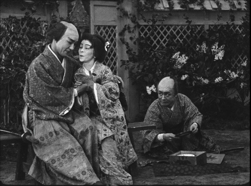 Porque relacionado con eso, hoy tuvimos una sesión de cortos interesantísima que narraban historias japonesas realizadas en occidente con buena parte de actores realmente autóctonos de Japón. Los primeros son tres cortos americanos de la Vitagraph en que se combinaban actores americanos caracterizados como orientales y japoneses de verdad. El trabajo de ambientación de los tres es magnífico, o al menos me lo parece a mí sin ser un experto en dicha cultura, y está lejos de parecer los típicos escenarios con cuatro elementos típicos japoneses para ambientar, sino que hay una escenografía muy cuidada e imágenes muy bellas de jardines.
