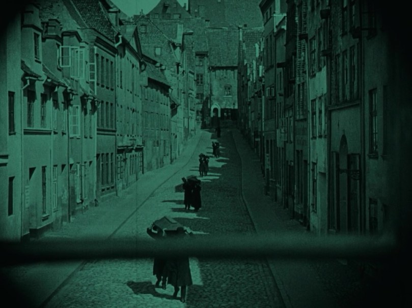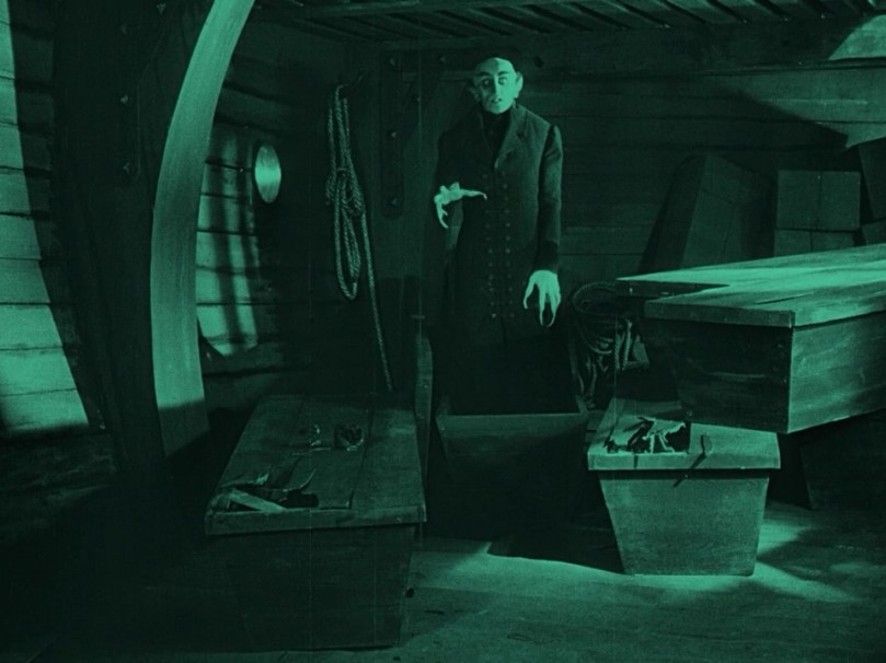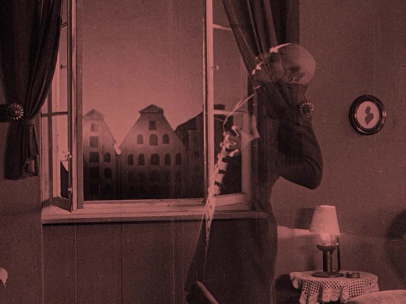 Tampoco vemos apenas a Nosferatu atacando, es más bien una presencia aterradora y acechante: la sobreimpresión del vampiro en la bodega del barco que resulta mucho más aterradora que cualquier imagen en que le viéramos en acción, el famoso plano de su sombra subiendo las escaleras para atacar a Ellen, el bellísimo y tan claramente significativo plano de la sombra de su mano cerrándose sobre el corazón de la joven o, uno que a mí personalmente siempre me ha resultado escalofriante, ése en que Orlock observa a Ellen desde la casa de enfrente, quizá porque da la sensación de que está mirando al espectador rompiendo la cuarta pared, o quizá por la idea que transmite de que el bucólico hogar burgués de los Hutter nunca se librará de esa presencia del mal vigilándoles justo enfrente.