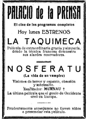 Esta «maravilla» del séptimo arte se estrenó en Viena en 1930 con el título de Nosferatu, pero luego se cambiaría a Die zwölfte Stunde, quizá para evitar nuevos problemas legales con la señora Stoker. Curiosamente, en otras partes del mundo se estrenó como si fuera el Nosferatu original sin ningún tipo de pudor. Es el caso de España, donde pueden comprobar cómo en estos anuncios de la época se hace referencia a que es una película sonora, de modo que aunque se use el título Nosferatu, se trataba de Die zwölfte Stunde.