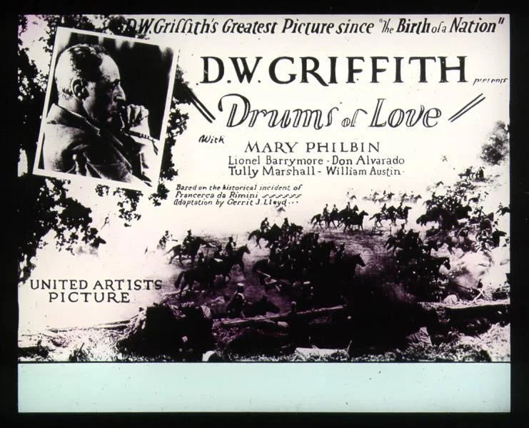 ¿Saben cuál es el único ejemplo que he encontrado en una diapositiva en que se usara como elemento promocional la imagen del director de la película (sin contar directores-actores como Chaplin)? Ni más ni menos que un filme de D.W. Griffith, que se anuncia no con escasa modestia como su mejor obra desde El Nacimiento de una Nación (The Birth of a Nation, 1915):