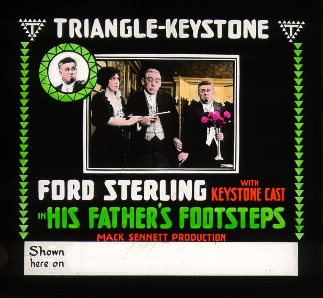 Me gustan éstas de la Keystone de la época en que el estudio estaba asociado con Triangle para ganar cierta respetabilidad. Fíjense en el significativo diseño tan elegante para lo que seguramente serían unas comedias alocadas, fomentando la figura del actor protagonista, y con los triángulos que dan nombre a la Triangle presentes por doquier. No se pierdan tampoco el que anuncia que el filme tendrá además «el típico reparto de la Keystone» sin concretar nombres, pero que ya da a entender que dicha promesa era suficiente aliciente para el público.