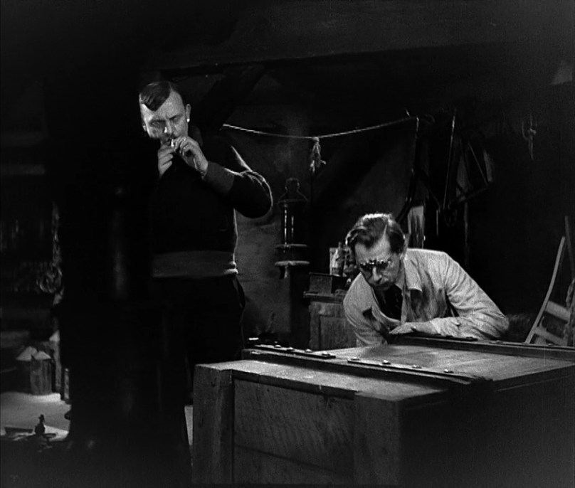 Y para rematarlo, fíjense cómo Lang introduce el primer diálogo de la película: lo hace sobre la transición en negro de esta escena a la siguiente, antes de que el negro haya dado paso a las imágenes, un recurso (anticipar el diálogo antes de la imagen a la que va asociada) que podría parecernos moderno y que los espectadores de esa época no sabrían asimilar, pero que vemos que existe desde los inicios del sonoro. Lo que oímos en ese diálogo es la voz del que será uno de los protagonistas del filme, el comisario de policía. ¿Y qué es lo que hace? Canturrea ¡y silba una melodía! ¿Quizá un guiño a la melodía tan importante de M, el Vampiro de Düsseldorf? Fijémonos cómo hemos pasado de una escena de puro suspense en que no hemos entendido nada de lo que ha sucedido (no sabíamos quiénes eran esos personajes, qué estaba espiando el hombre de la pistola y por qué le querían matar) para entrar en otro espacio donde el que es el héroe de la película nos es introducido con un motivo cómico y ligero: canturrea más mal que bien una melodía y habla en tono socarrón con su ayudante. Eso, que nos es transmitido por el sonido, es lo primero que sabemos de él, y supone para Lang una forma de salirse del tópico de detective serio e infalible.