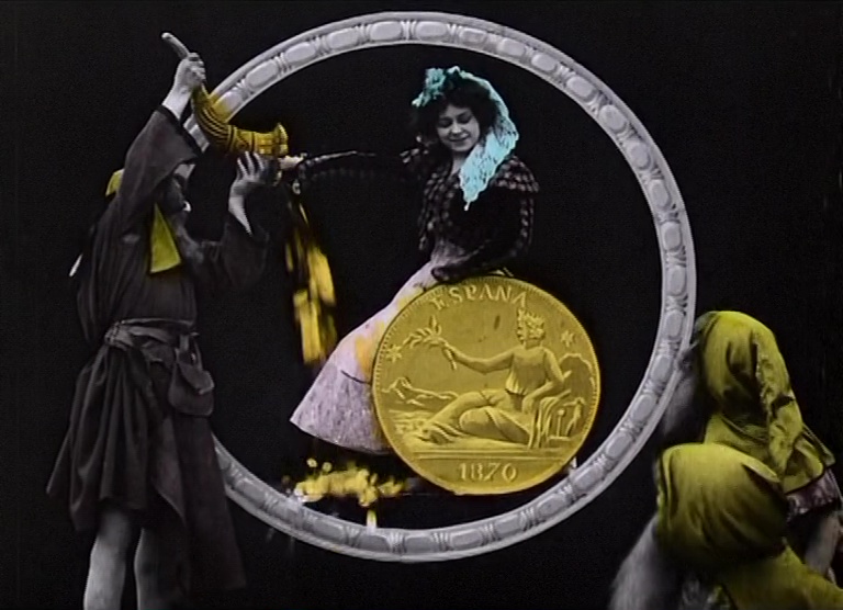 ¿Nunca se han preguntado cómo se fabrica el dinero? La protagonista de Au pays de l’Or (1908) sorprende a unos duendecillos en un bosque cargando monedas y, conducida por un hada, acaba en un sitio misterioso donde contempla de primera mano cómo se fabrica el dinero. Aquí vemos todo el proceso, que comienza con los duendes cargando con el oro líquido y luego solidificándolo en monedas. A partir de aquí reconozco que me pierdo un poco entre tanta aparición, humo y efectos especiales, que incluyen desde una cabeza gigante que escupe monedas a diversas mujeres que representan las monedas de cada país.