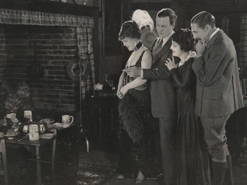 Plano memorable: Will Rogers y el rey jugando a póker en A Truthful Liar (1924) vistos como siluetas desde el otro lado de una ventana tapada con una cortina, que luego nos muestra en la ventana de al lado a la reina esperando furiosa.