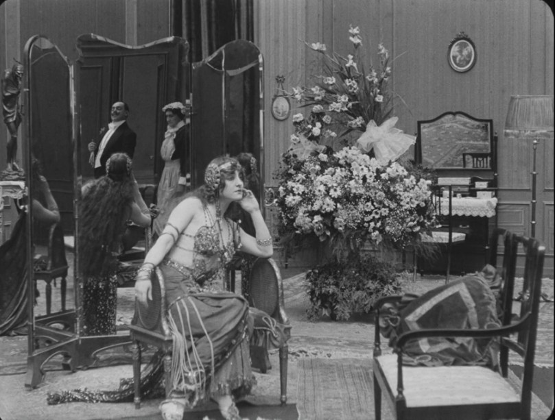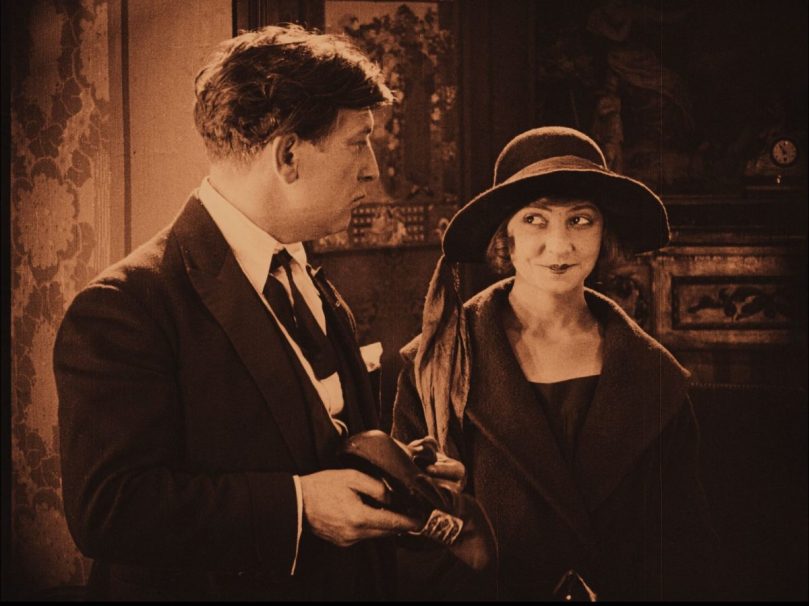 El viernes fue un día con bastantes cortometrajes, y por la tarde tuvimos cuatro cortos europeos de slapstick muy divertidos sobre matrimonios en crisis. De er Splittergale (1919) de Lau Lauritzen es una comedia basada en una confusión en la publicación de dos anuncios en un periódico, que llevan a que una ruda y grandota enfermera acuda al estudio de un pintor que busca una modelo, y a que una guapa modelo vaya a casa de un anciano que busca una enfermera. Del mismo director tenemos En Sølvbryllupsdag (1920), sobre un matrimonio a las puertas de sus bodas de plata que pasa de tener un despertar cariñoso a sufrir una riña en la que ella abandona el hogar. El problema es que entonces llega un abogado con una herencia con una de esas cláusulas estándar que tantas veces hemos visto en películas: solo podrá cobrarse si el protagonista demuestra tener una feliz vida matrimonial. El corto se basa en la frenética búsqueda del marido a su esposa por toda la ciudad, pero el mejor toque cómico son los planos intercalados del abogado esperando con una botella de vino que le ha proporcionado el protagonista para que se entretenga. El actor está soberbio con ese contraste entre su expresión fría y profesional y las peligrosamente generosas dosis de vino que se va sirviendo compensando con un chorro simbólico de sifón. A medida que avanza el corto, la botella está cada vez más vacía y su expresión es menos hierática, hasta que al final acaba borracho perdido.