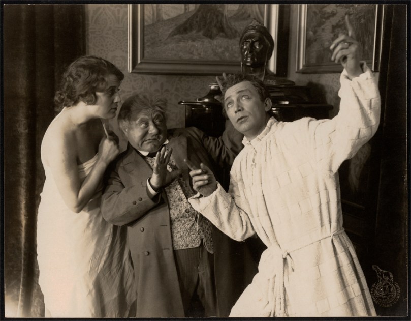 El viernes fue un día con bastantes cortometrajes, y por la tarde tuvimos cuatro cortos europeos de slapstick muy divertidos sobre matrimonios en crisis. De er Splittergale (1919) de Lau Lauritzen es una comedia basada en una confusión en la publicación de dos anuncios en un periódico, que llevan a que una ruda y grandota enfermera acuda al estudio de un pintor que busca una modelo, y a que una guapa modelo vaya a casa de un anciano que busca una enfermera. Del mismo director tenemos En Sølvbryllupsdag (1920), sobre un matrimonio a las puertas de sus bodas de plata que pasa de tener un despertar cariñoso a sufrir una riña en la que ella abandona el hogar. El problema es que entonces llega un abogado con una herencia con una de esas cláusulas estándar que tantas veces hemos visto en películas: solo podrá cobrarse si el protagonista demuestra tener una feliz vida matrimonial. El corto se basa en la frenética búsqueda del marido a su esposa por toda la ciudad, pero el mejor toque cómico son los planos intercalados del abogado esperando con una botella de vino que le ha proporcionado el protagonista para que se entretenga. El actor está soberbio con ese contraste entre su expresión fría y profesional y las peligrosamente generosas dosis de vino que se va sirviendo compensando con un chorro simbólico de sifón. A medida que avanza el corto, la botella está cada vez más vacía y su expresión es menos hierática, hasta que al final acaba borracho perdido.