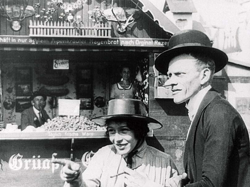 Pasando a Alemania, Wir Halten Fest und Treu Zusammen (1929) de Herbert Nossen con el dúo cómico Siegfried Arno y Kurt Gerron me tiene fascinado por un curioso motivo, y es que podría ser el corto cómico menos humorístico que he visto nunca. No es que los gags fallen, es que la mayoría de veces ni siquiera parece que lo intenten. El tono es casi desabrido, los personajes se mueven lentamente, no hay ritmo. Es algo muy extraño, y quizá no ayude el hecho de que solo se conserve un fragmento, pero lo que vi me hizo comprender por qué este dúo humorístico no tuvo mucho éxito. Por último, vimos otro cortometraje de Karl Valentin no especialmente remarcable en que parecía más bien que se dedicó a improvisar gags en el Oktoberfest con una actriz que hacía pareja con él. Muy en la línea de cortos de la Keystone improvisados en sitios públicos, como el que comentamos en el artículo anterior.