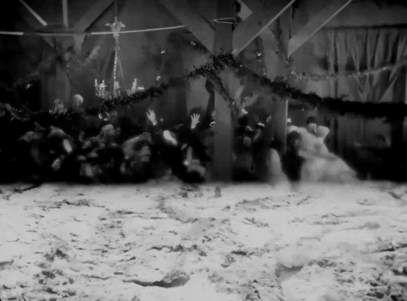 Lo interesante de esto es que Tsutsunava no nos muestra un plano del puente viniéndose abajo, lo sobreentendemos por el montaje, y en su lugar nos ofrece algo mucho más interesante: combina en un mismo plano la marea de agua que lo engulle todo a su paso con otro de los asistentes a la fiesta asustados. Es una manera simbólicamente muy gráfica de dar a entender la idea de cómo la gran tormenta socialista arrasaría con el poder zarista. Y si eso además nos sirve para hacer algo tan del gusto del cine soviético como es alardear de sus maquinarias y construcciones insertando imágenes contemporáneas (eso es, de 1928) de la nueva y eficaz presa que se ha levantado para canalizar ese agua (¡con estatua de Lenin incluida!)… pues mejor que mejor, ¿verdad?