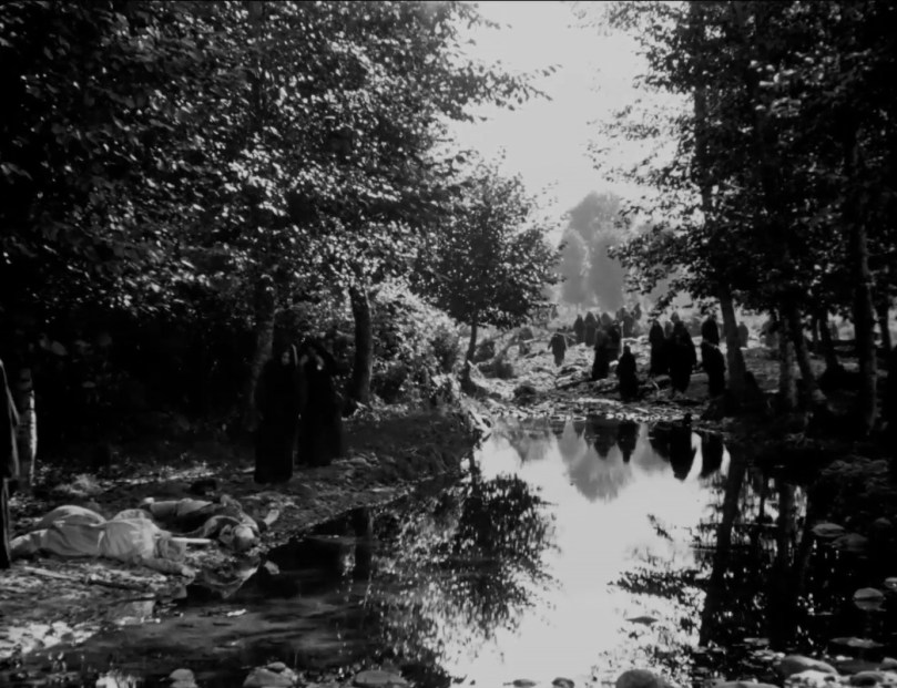 En primer lugar se nos muestra a todas las viudas y madres que han perdido a sus hijos vestidas de luto caminando en una larga y majestuosa procesión fúnebre. El plano de esas figuras vestidas de negro reflejadas en el río es especialmente evocadora, casi parecen más espíritus o fantasmas que se mueven inquietos por lo que han sufrido.