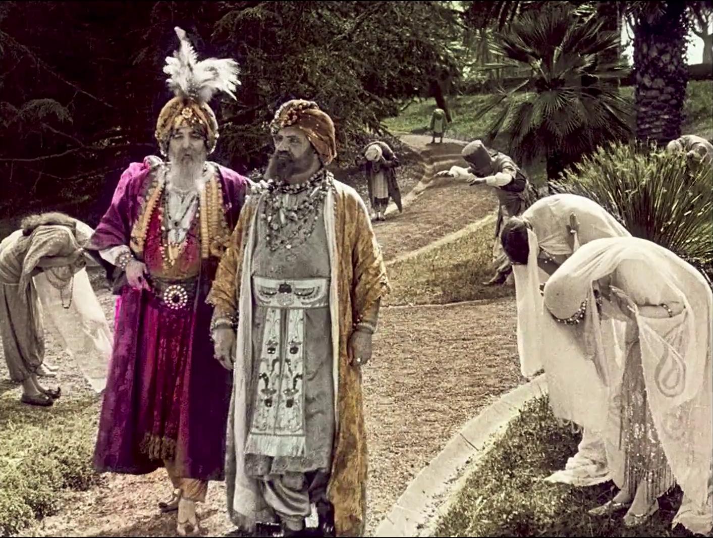 Por la noche nos esperaba la fantasía oriental La Sultane de l’Amour (1919) de Charles Burguet y René Le Somptier, una ambiciosa producción francesa que aspiraba en su momento a competir con las grandes producciones americanas que inevitablemente estaban invadiendo el mercado europeo. Siendo una buena película con los clásicos ingredientes exóticos (sultanes crueles, un príncipe y una princesa enamorados, escenas de pelea con espadas…), si por algo destaca claramente es por su asombroso trabajo con el color, ya que es el primer filme totalmente en color de la historia del cine francés. De hecho esta versión coloreada se estrenó en 1923 después de que 50 artistas hubieran dedicado cuatro años en colorear a mano hasta 100.000 imágenes.
