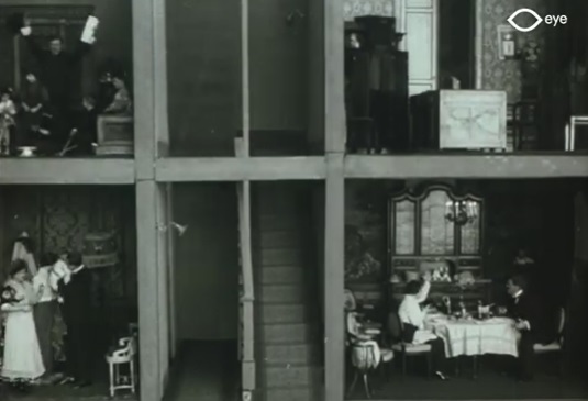 Es un plano que requiere un cierto trabajo a nivel de diseño de producción que, y eso es lo que más me llama la atención, en realidad resulta narrativamente innecesario. Al principio yo me pensaba que se extraerían ciertos gags de esa confluencia de habitajes, pero no es así, la razón de ser del plano es el mero placer de disfrutar de este hallazgo visual/gag en sí mismo. Y esta es una de las cosas que me encanta del cine mudo y que podemos encontrar en muchos filmes de esa década tan infravalorada como son los años 10: un cierto placer por probar cosas nuevas simplemente porque pueden ser visualmente interesantes, llamativas o divertidas, sin que haya una necesidad de hacer tanto esfuerzo para el funcionamiento de la historia (y más si estamos hablando de un cortometraje).